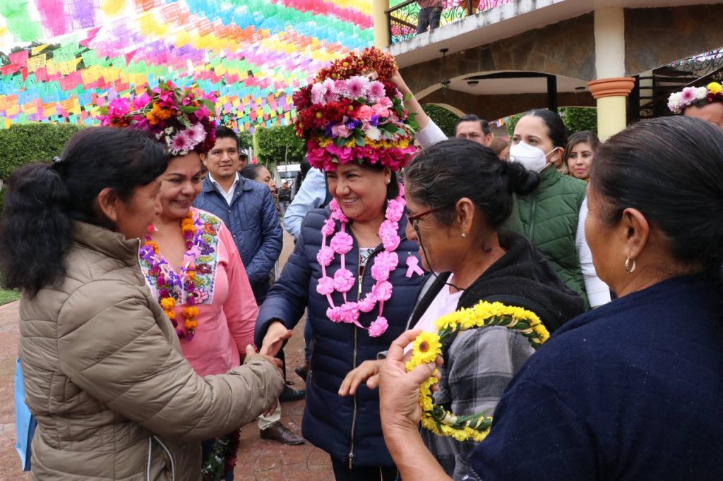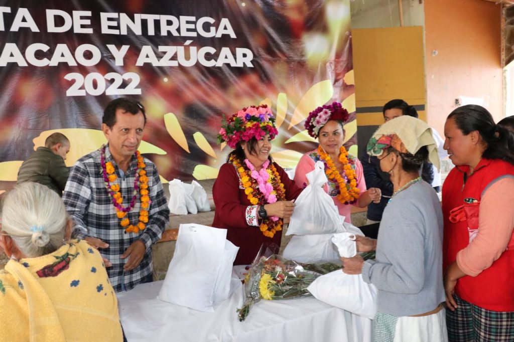 En este acto, realizado en Atlapexco y en el que estuvo acompañada por Reyna Guerrero, titular del Sistema DIF municipal y del alcalde Joel Hernández, se entregaron simbólicamente 350 dotaciones que forman parte de un total de 6 mil 500 paquetes de cacao y azúcar.