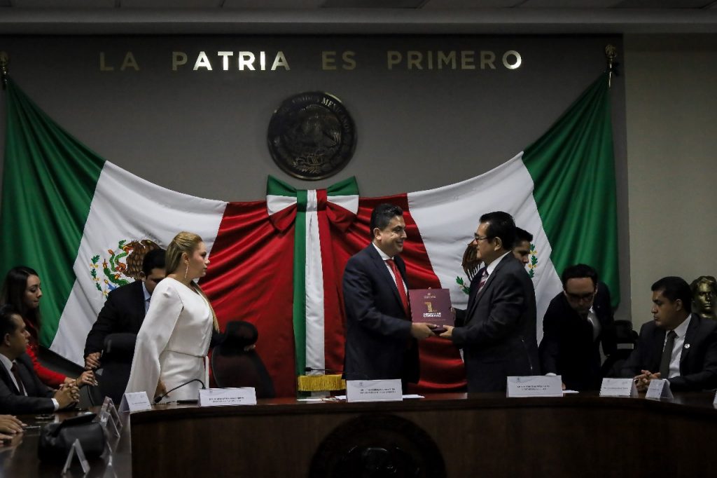 El Primer Informe de labores fue recibido por el actual presidente de la Junta de Gobierno del Congreso del Estado, el diputado Osiris Leines Medécigo, y la presidenta de la Mesa Directiva, la legisladora Sharon Macotela.