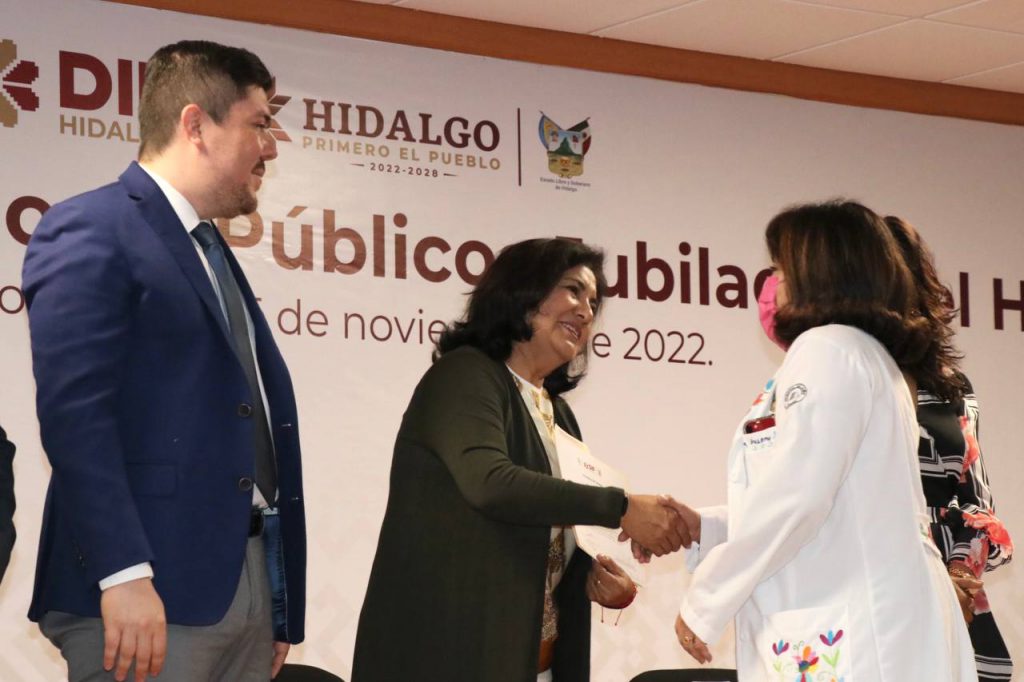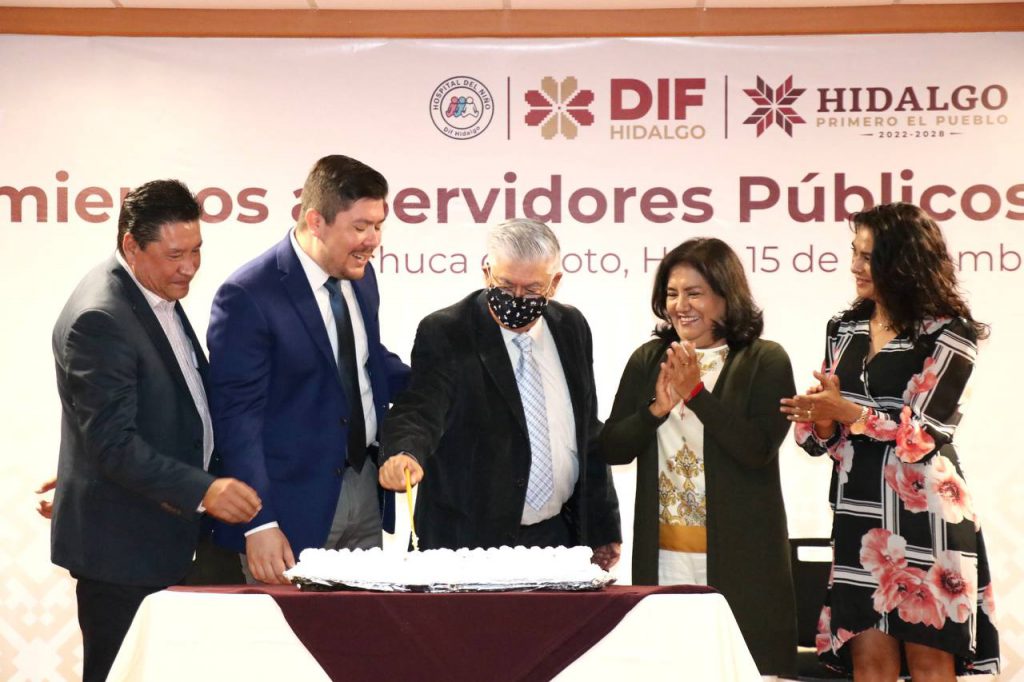 Edda Vite, presidenta del Patronato del Sistema DIF Hidalgo en compañía de Celia Chavarín, directora general de Desarrollo Social DIFH; Rubén Hurtado, director del Hospital del Niño DIF y Víctor Licona, secretario general del Sindicato Único de Trabajadores al Servicio del Poder Ejecutivo del Estado de Hidalgo (SUTSPEEH); entregaron reconocimientos honoríficos a 22 servidoras y servidores públicos que culminaron su etapa laboral en 2021.