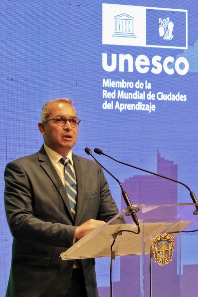 El coordinador de la Red Mundial de Ciudades del aprendizaje de la UNESCO, Raúl Valdés, entregó al presidente Sergio Baños Rubio el nombramiento que acredita a Pachuca como ciudad del Aprendizaje.